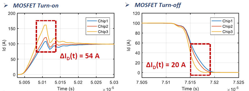 碳化硅SiC電控系統(tǒng)的開發(fā)難點(diǎn)主要在于SiC模塊的本體設(shè)計(jì)及高速開關(guān)帶來的系統(tǒng)EMC問題應(yīng)對。臻驅(qū)科技開發(fā)的這臺電機(jī)控制器采用了日本羅姆ROHM最新發(fā)布的第四代碳化硅SiC芯片。相較于傳統(tǒng)的IGBT器件,SiC器件在實(shí)際多芯片并聯(lián)應(yīng)用時(shí)會出現(xiàn)許多本體設(shè)計(jì)挑戰(zhàn),如多芯片間的電流不均衡會導(dǎo)致進(jìn)一步的熱不均限制芯片的滿額使用(如圖1改善前與改善后的對比),芯片結(jié)電容與回路漏感構(gòu)成的LC諧振,同時(shí)高的di/dt在回路漏感上產(chǎn)生較大的電壓過沖限制了模塊的輸出能力等,綜合來看重點(diǎn)在于多維度設(shè)計(jì)考慮,避免單一因素的短板效應(yīng)制約SiC在輸出能力、效率等方面的優(yōu)勢。同時(shí)還需考慮工藝及成本選擇適合現(xiàn)有系統(tǒng)的封裝方案,而不是一味地引入新的材料和工藝技術(shù)。