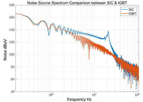 圖2  重復(fù)性脈沖頻譜對比,相較IGBT可看到由于SiC高速開關(guān)帶來的MHz級幅值抬升,以及振蕩帶來的20MHz左右頻譜尖峰