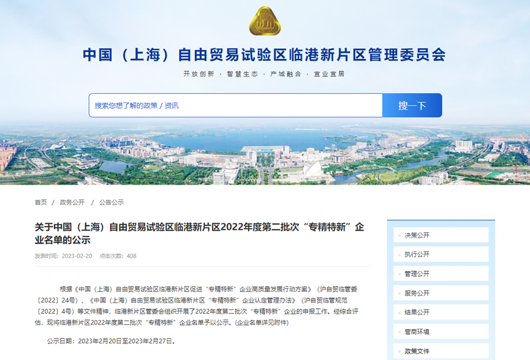 喜報|研究院成功入選臨港新片區“專精特新”企業